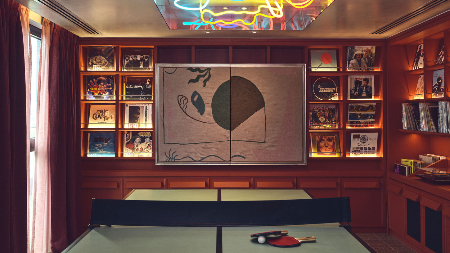 The stand out pieces for this project were the bespoke ping-pong table/bench set, created with a combination of Valcromat colours and black stained ash detailing and a solid elm slab end table created which timber from fallen trees from the city of London.